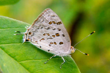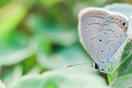 Dark Cerulean butterfly perching on green leaf with nature blurred background, in Thailand.