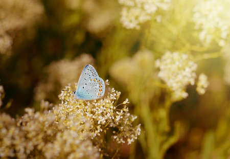 Beautiful small Blue butterfly, Polyommatus icarus, on a wild meadow. Summer season background with vintage filter effect