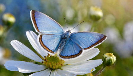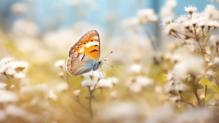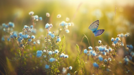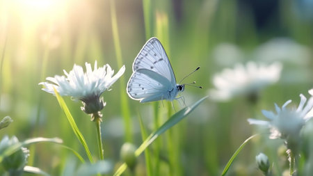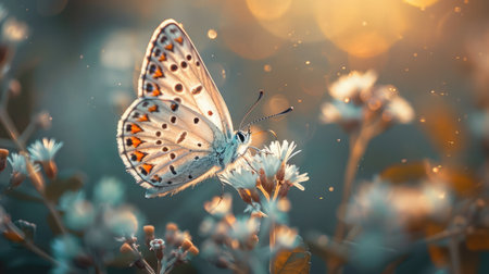 A delicate butterfly rests gently on wildflowers in a peaceful meadow. Soft light bathes the scene.