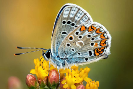 Close up of adonis blue butterfly feeding on small pink and yellow flowers with blurred yellow background