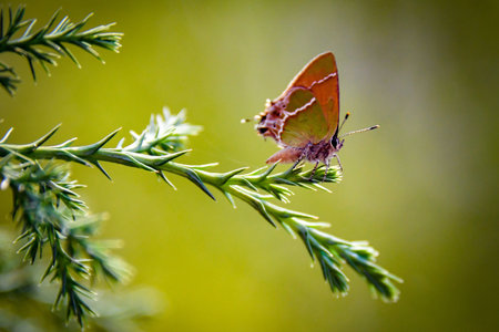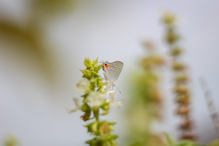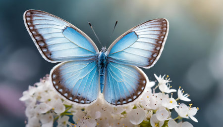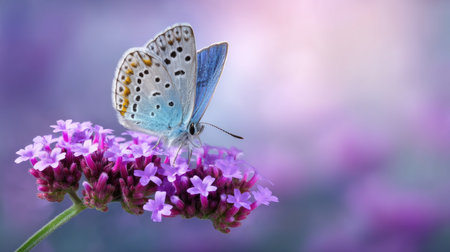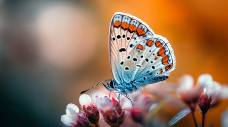 A butterfly rests gracefully on small, pink flowers. The image showcases delicate wings with fine details and textures. Soft focus and bokeh create a dreamy quality. The scene is illuminated by natural light, suggesting an outdoor environment. Suitable for editorial and commercial use.