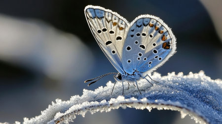 A delicate silver butterfly resting on a frost-covered leaf, symbolizing beauty in nature.