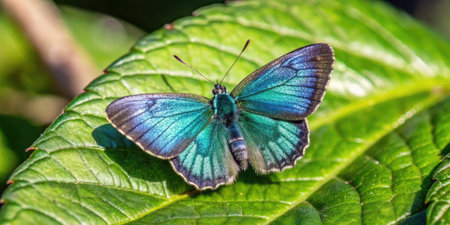 A close-up of a light blue butterfly resting on a green leaf, its delicate wings glowing in the sunlight.