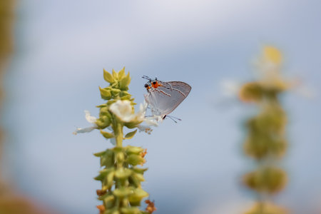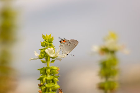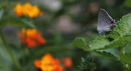 Gray Hairstreak Butterfly - Strymon melinus on Lantana Leaf outdoors in summer