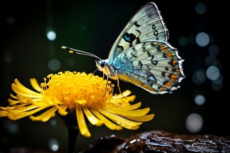 A vibrant butterfly rests gracefully on a blooming flower petal, adorned with glistening dew drops, capturing the essence of nature's beauty in a serene garden.