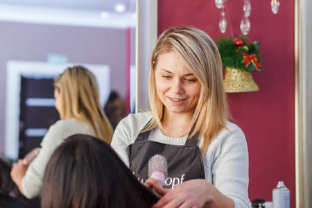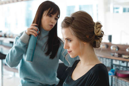 Kyiv, Ukraine - March 3, 2017: Hairdresser getting hair done with hair spray. Side view of a young beautiful woman sitting in hair salon and looking into the mirror while her.