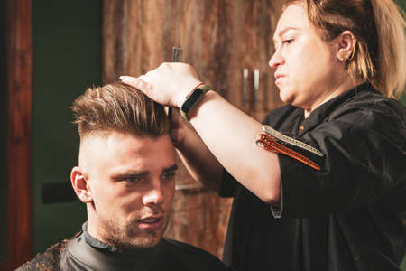 Girl hairdresser doing hairstyle and styling with scissors and comb to a young man.