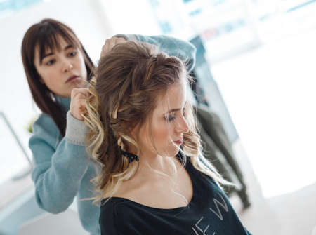 Hair styling. Young long-haired woman making hairstyling in a hair salon