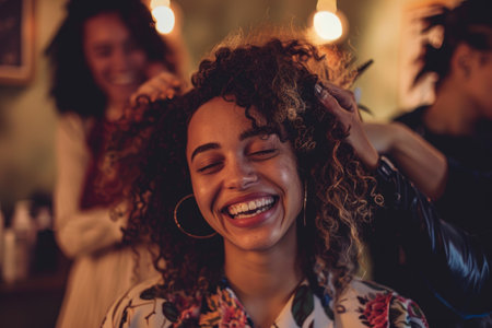 A woman smiles happily as she gets her hair styled by a professional hairdresser in a salon, A group of friends laughing and talking while getting their hair styled together
