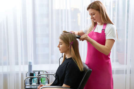 Master woman hairdresser gently curls hair curling girl in a beauty salon. Hair styling