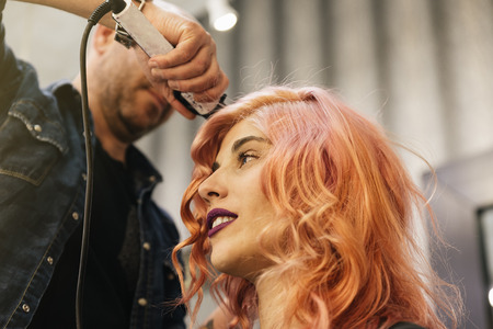 Close up view of a young woman getting a new hairstyle at the hair salon.