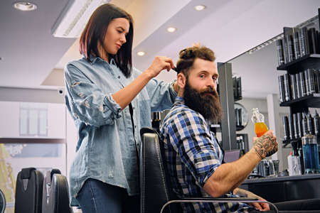 Female hairdresser cutting hair of bearded hipster male in a saloon.
