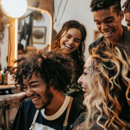 A group of friends standing around each other, laughing and talking, A group of friends laughing and talking while getting their hair styled together