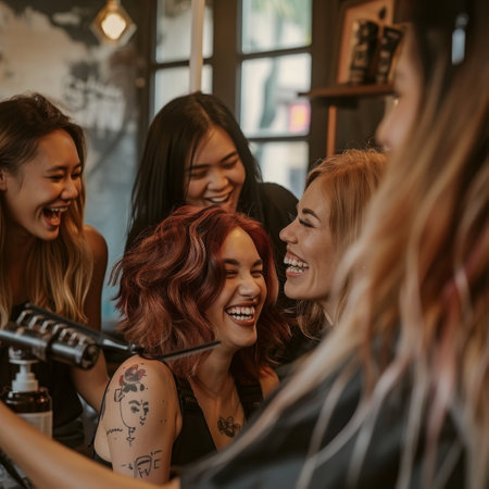 A woman smiles happily as she gets her hair styled by a professional hairdresser in a salon, A group of friends laughing and talking while getting their hair styled together