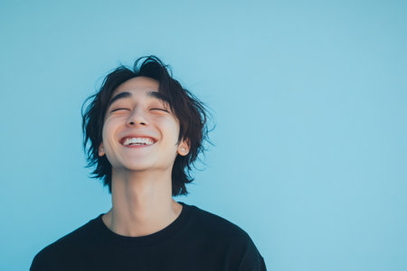 Young Asian man laughing with closed eyes, expressing happiness and positivity against a light blue background