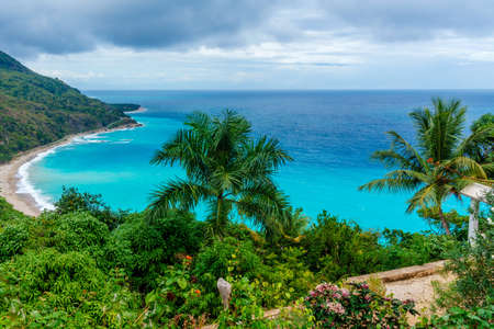 picturesque natural wild landscape with rocky mountains overgrown dense green jungle tree, palm and clear azure water of sea ocean. Dominican Republic