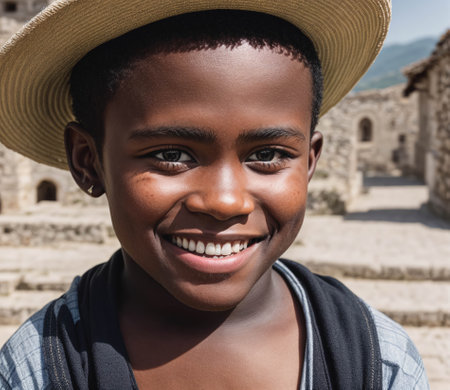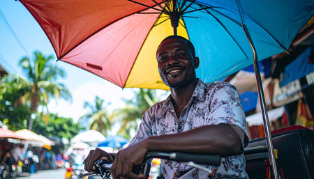 Generative AI depicts a Jamaican woman commuting by transport while smiling and having pleasure in the sun.