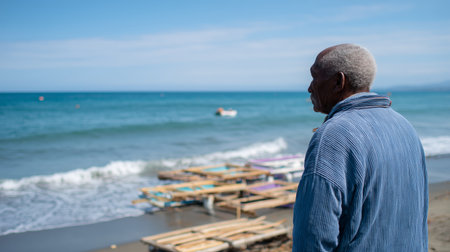 Senior man gazing at the ocean from a sandy beach under a clear sky in the afternoon