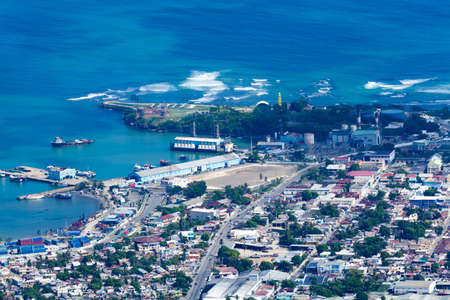 Ships, boats, containers, industrial buildings at the Puerto Plata harbor, port and cityscape, Dominican Republic