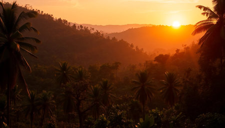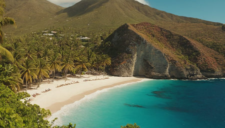 Tranquil and serene tropical beach paradise with secluded sandy beaches, lush greenery, and palm trees for a perfect vacation destination