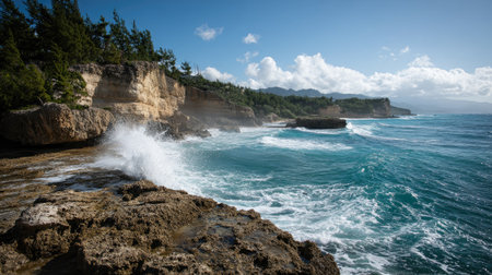 Explore a breathtaking coastal landscape featuring waves crashing against rocky shores, surrounded by lush greenery and towering cliffs under a bright sky.