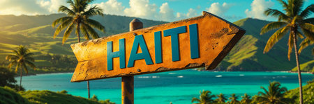on the pole there is a direction arrow with the inscription Haiti against the background of a picturesque summer landscape