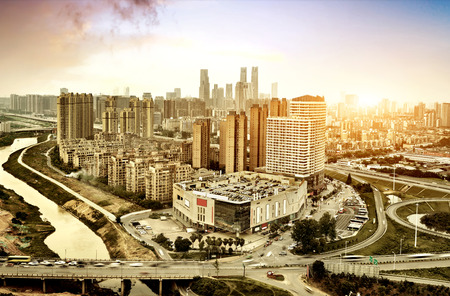 Chengdu, Sichuan province, China - Aug 11, 2019 - Chengdu city skyline aerial view in late afternoon with Jinjiang river.