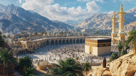 Colorful crowd of pilgrims surrounds the sacred kaaba, generative AI