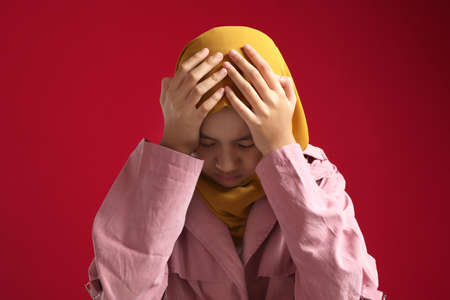 Portrait of sad young Asian muslim girl wearing hijab crying against red background, despression concept
