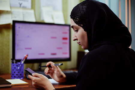 Middle eastern female entrepreneur. Busy Arabian businesswoman. A middle-aged woman in traditional Arabian clothing hijab or abaya working writing on notepad