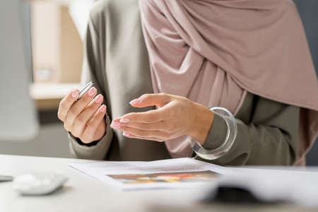 Hands of young teacher in hijab sitting by desk and explaining subject during online lesson or training