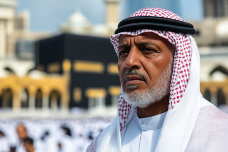 Senior man wearing traditional headscarf, gazing thoughtfully into the distance, capturing a moment of reflection and serenity.