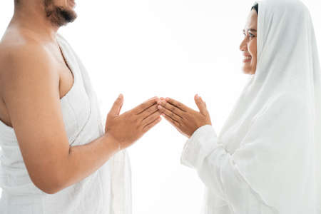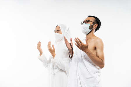 Asian woman and man wearing ihram clothes and mask with two palms up in prayer on isolated background