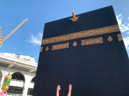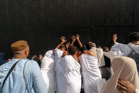 MECCA, SAUDI ARABIA - JUNE 30: Unidentified Muslim pilgrims in white ihram touch black cloth of Kaaba with Allah and Muhammad (peace be upon him) inscriptions on June 30 2019 in Mecca Saudi Arabia.