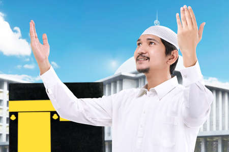 Asian Muslim man standing and praying with Kaaba view and blue sky background