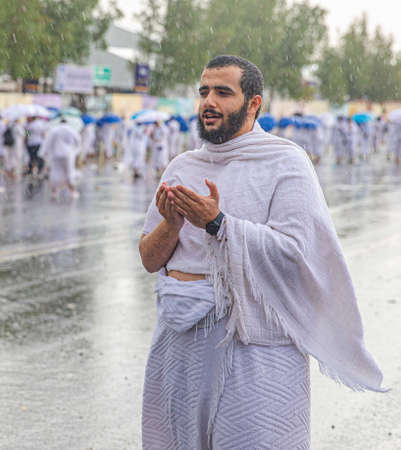 Muslim pilgrims praying on jabal Arafat, HajjHajj pilgrim prayingMuslim man wearing hajj cloth, Mecca, Saudi Arabia, August 10, 2019