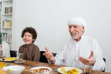 happy muslim man pointing with hands near laughing arabian grandson during family dinner