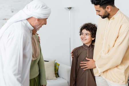 positive arabian man smiling near interracial muslim parents on sofa at home
