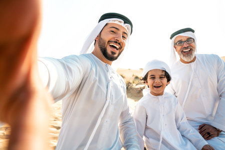 Three generation family making a safari in the desert of Dubai wearing white kandura outfit. Grandfather, son and grandson spending time together in the nature.