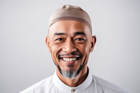 Portrait of a smiling muslim man wearing hat over white background