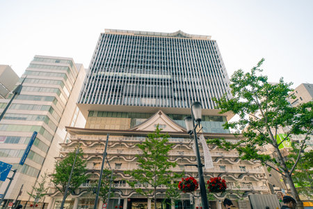 Sapporo cityscape with buildings, road, cars and walking people in Hokkaido, Japan.