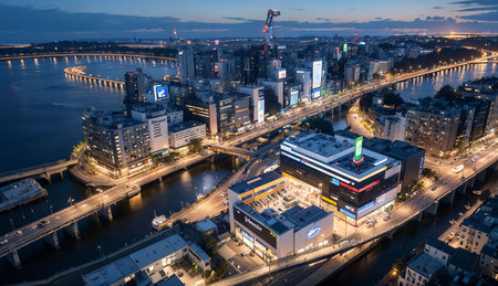 Twilight panoramic view of busy financial district above illuminated city generated by artificial intelligence