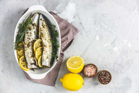 Fresh fish with spices and herbs on table in kitchen. Fresh sea bass. Top view with copy space.