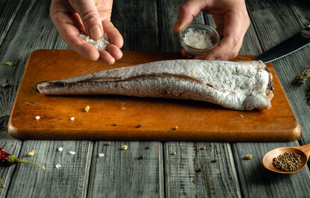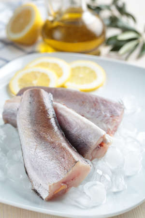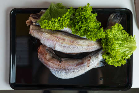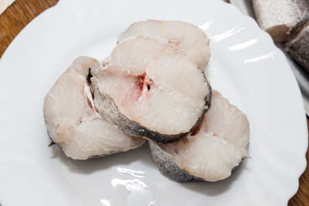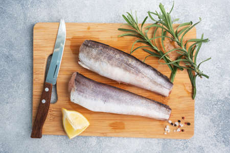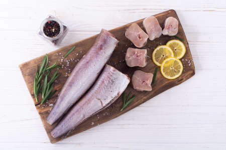 Raw fish hake. Abstract culinary background. Cooking healthy diet food. Selective focus.