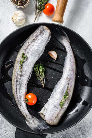 Whole fish Pollock in a pan. Raw seafood. White background. Top view.