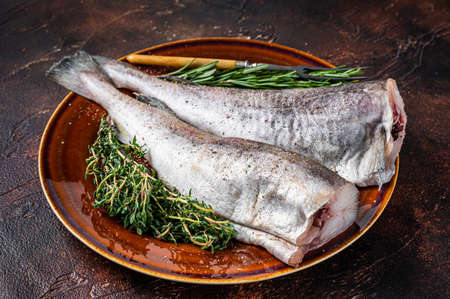 Uncooked Raw cod or codfish fish in rustic plate with herbs and fork. Dark background. Top view