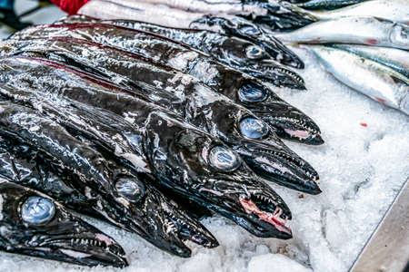 Fresh sea fish in ice on mercat de la boqueria Barcelona, Spain. Focus on head front fish.