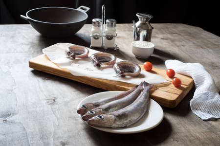 Blue whiting or lilies, fish on the table prepared to be cleaned and cooked in different ways, battered, baked, pickled. Tasty and healthy seasonal white fish.