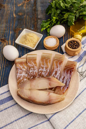 Raw fillet of saithe and frying ingredients. Fresh slices on a plate, spices, eggs, oil, breadcrumbs, parsley. A bunch of greens, vintage napkin. Old wooden boards background, close up