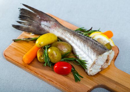 Baked hake tail with vegetables recipe - 250g hake or other cod-like fish tail rub with salt and pepper, bake in oven at220C for 20 min. Serve with potatoes and fresh vegetables